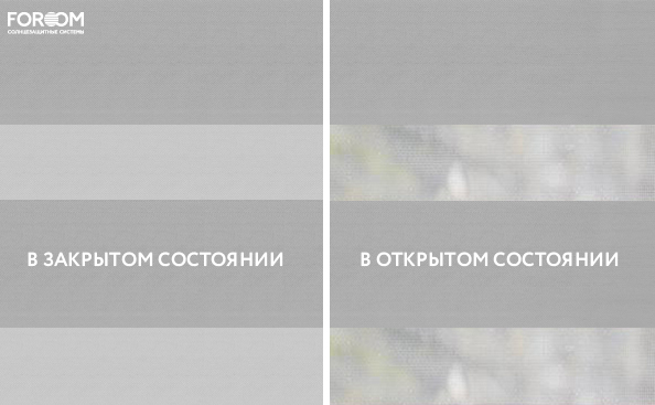 Полотно ткани, состоит из чередующихся горизонтальных полос – прозрачных и непрозрачных. Изменяя положение этих полос относительно друг другу, можно создать целых 3 режима регулировки светом. Например, чтобы в помещении стало светлее, нужно расположить прозрачные полосы друг напротив друга. Если разместить прозрачную и непрозрачную полосу параллельно друг другу, то можно добиться практически полного затемнения.